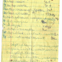 A wooden recipe card box, decorated with strawberries with text that reads “RECIPES,” that is used to house part of Deborah Szmodis’s recipe card collection. The bottom of the box has a small sticker that reads “Woodcrest by Styson” and “Made in Japan.” It is part of a larger matching kitchen storage collection from the 1960s.